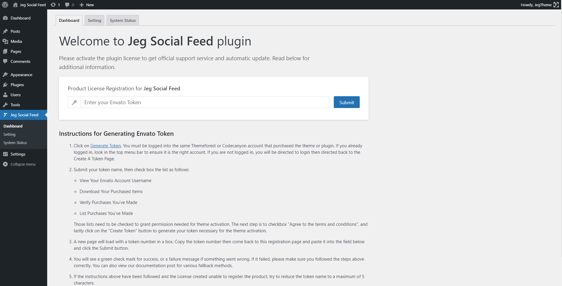 - Click on Generate Token. You must be logged into the same CodeCanyon account that purchased Jeg Social Feed. If you are logged in already, look on the top menu bar to ensure it is the right account. If you are not logged in, you will be directed to the login page (Themeforest) then redirected back to the Create A Token Page.