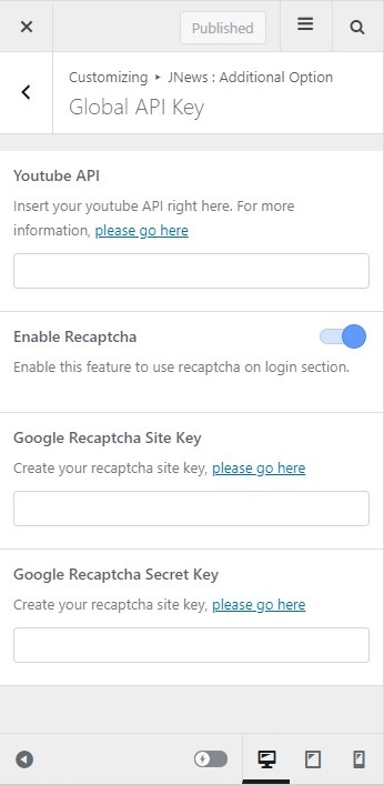Insert your Youtube API here. For more information please visit this page. This API will be required by JNews Youtube/Vimeo Playlist. - Enable Recaptcha