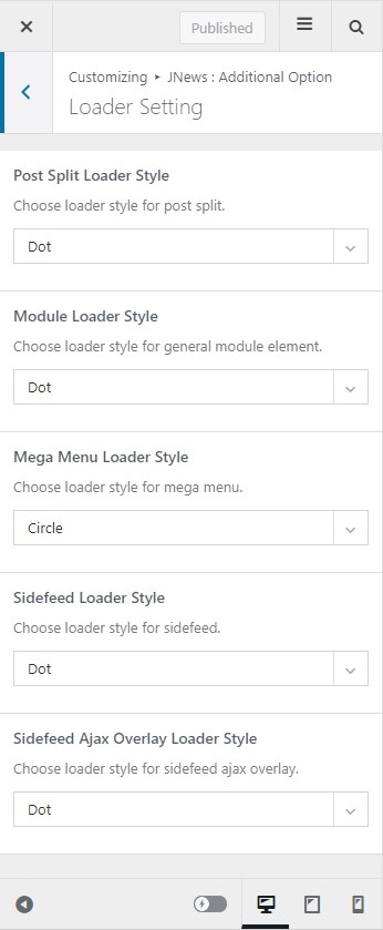 In this part, you can setup a general loader type that will be used on certain elements such as post-split, module block, mega menu, and side-feed element.