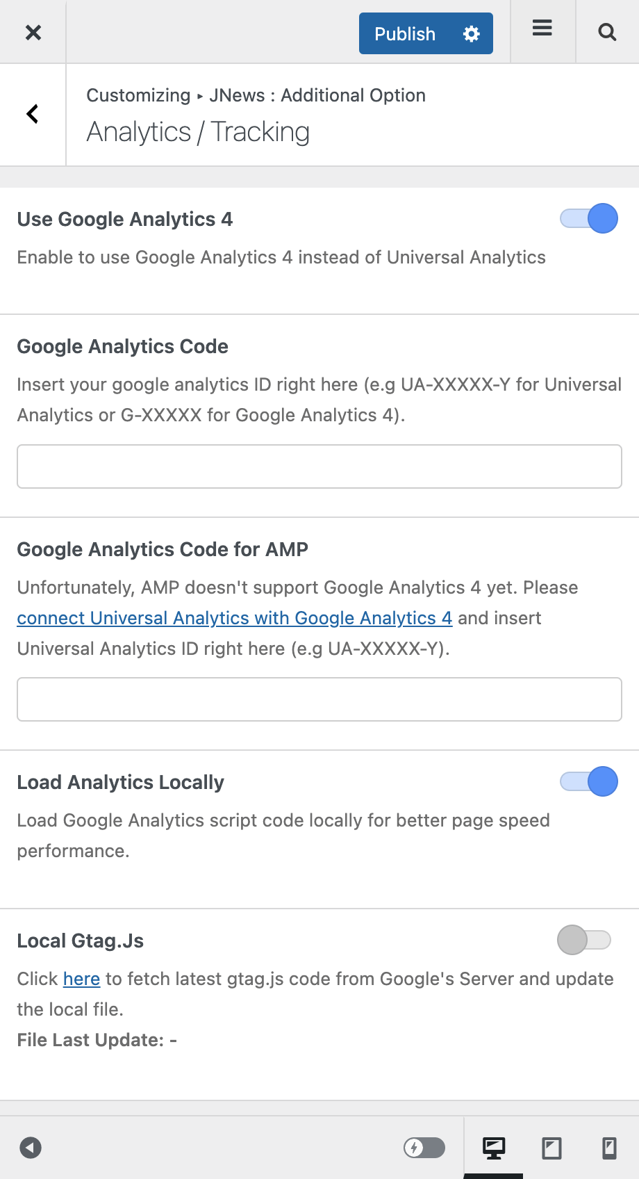 Unfortunately, AMP doesn’t support Google Analytics 4 yet. Insert your Universal Analytics ID right here. Please note, this option will appear and work if you activated AMP and JNews – AMP plugin. - Load Analytics Locally