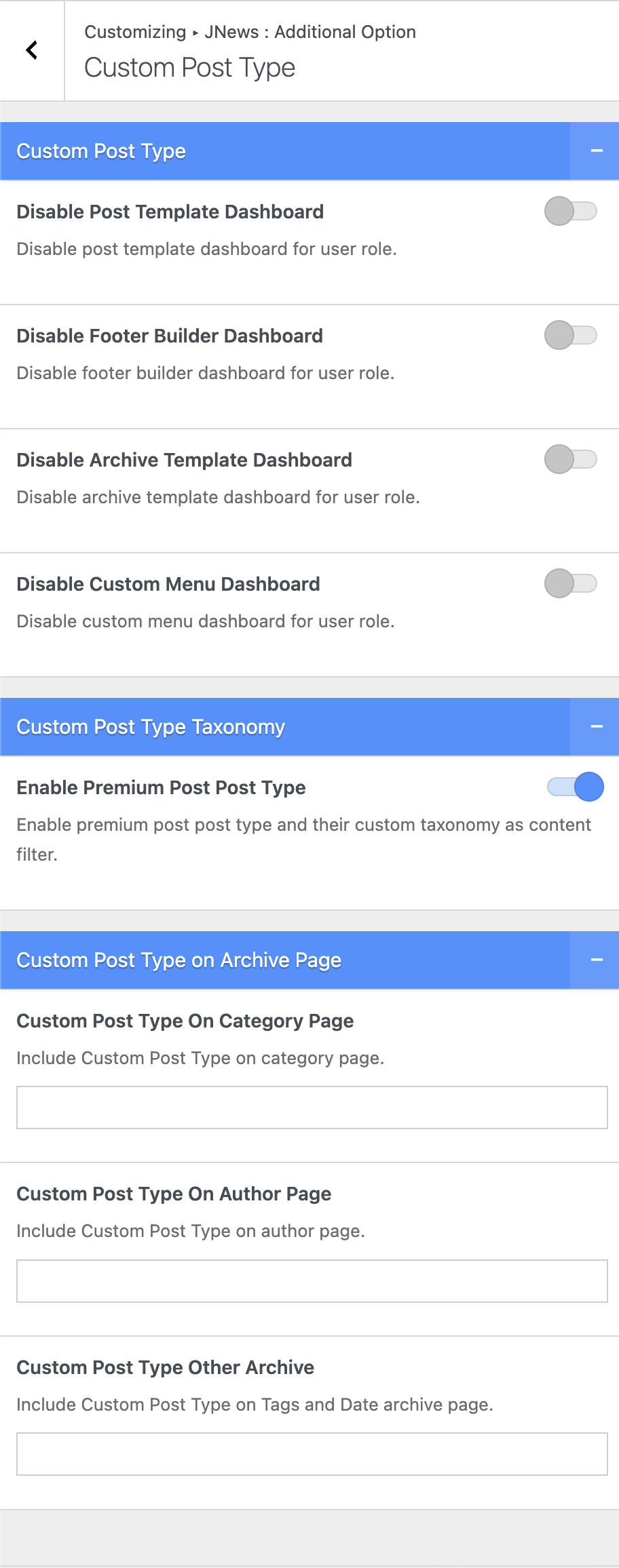 This option will allow you to disable JNews default Custom Post Type menu (Single Post Template, Footer Builder, Archive Template, and Custom Menu ) to a certain User Role. - Custom Post Type Taxonomy
