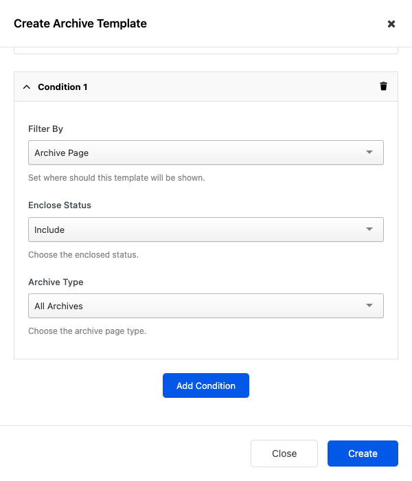 To start creating an archive template, you can click on the Add New Template button and you will be greeted by the Create Archive Template interface where you can name and set up the condition for the current archive template.