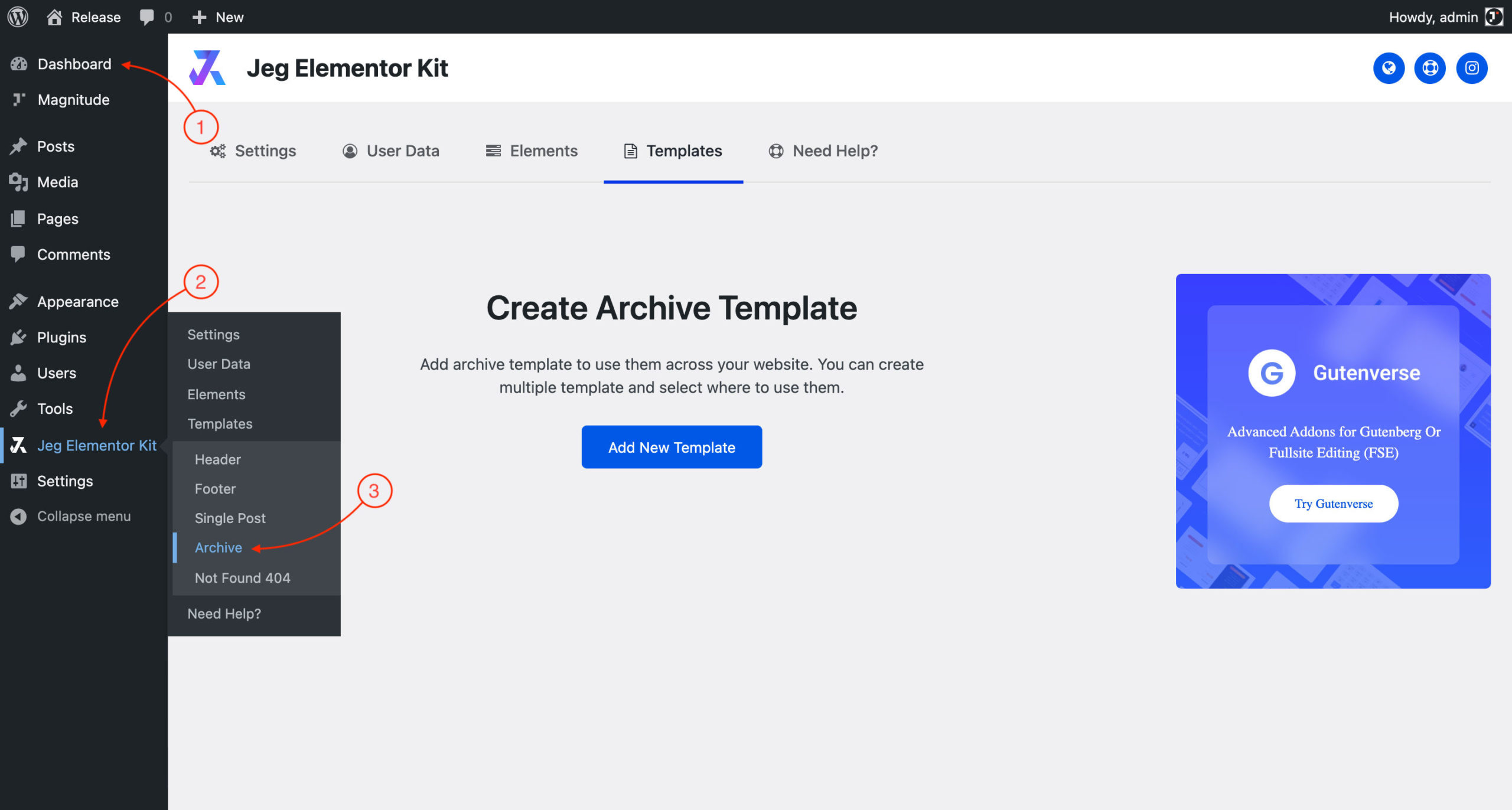 To begin configuring the Archive template, please go to WordPress DashboardJeg Elementor KitArchive