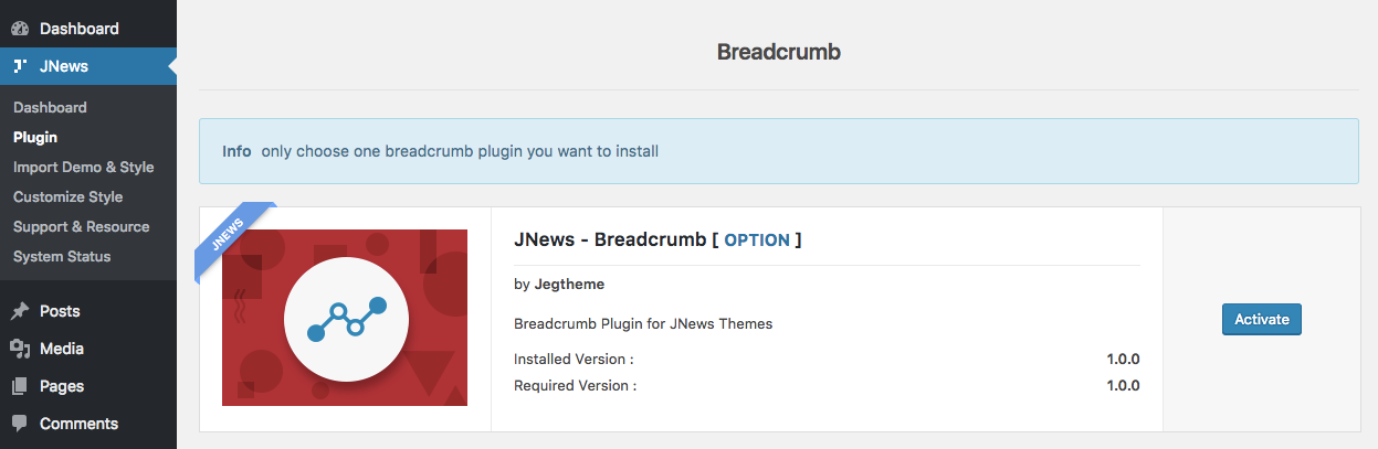 To use JNews Breadcrumb plugin, you can easily install and activate this plugin from Plugin Dashboard by going to JNews Dashboard → Plugin