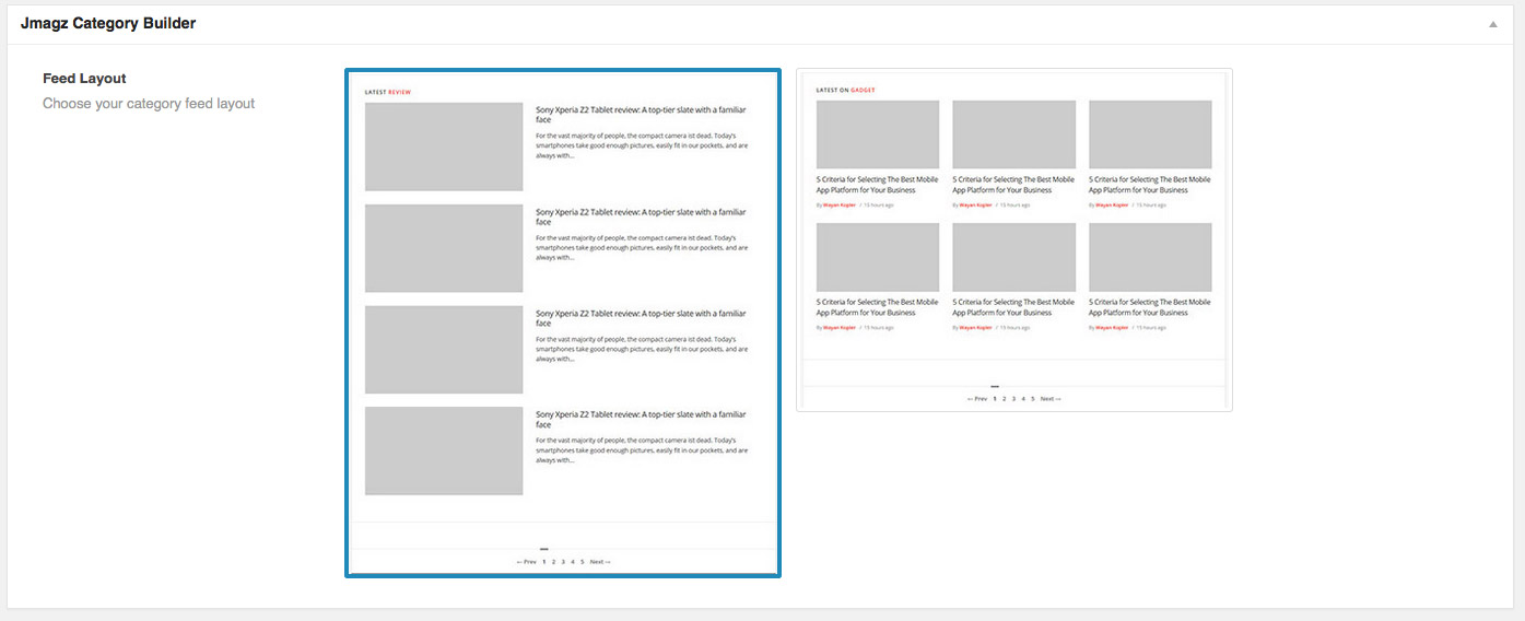 Most of customer want custom layout for each Category. With Jmagz, we provide option to build your own category layout. On version 1.0.0 we only provide Category Builder for Post Category. we have plan to broader option into Review Category and Review Brand.