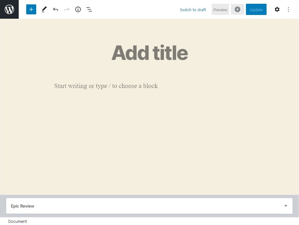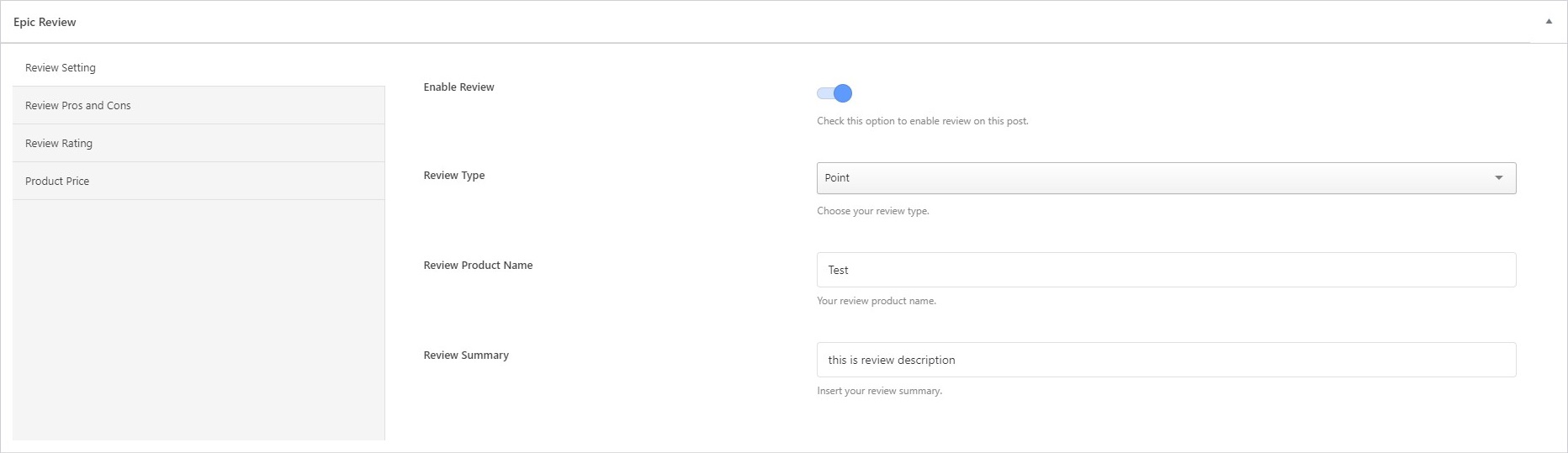 After you are done with the plugin activation, you can start building your review posts. You can create the review in WP Dashboard → Posts → Add New. Below your post editor, you will see a metabox called Epic Review.