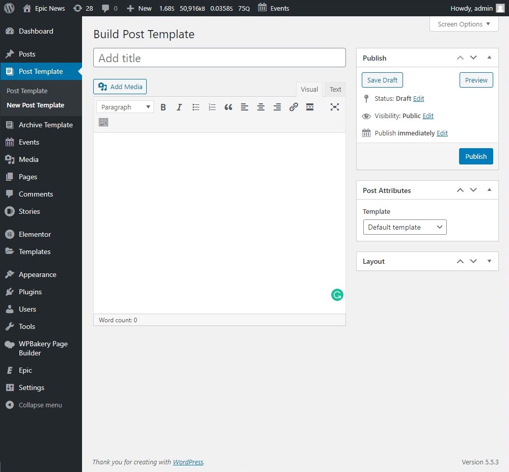 Firstly you will need to create a new template. You just need to go to WordPress Dashboard > Post Template > Add New. We already provide specify elements for custom post template. You can find the element under Post Template element category.