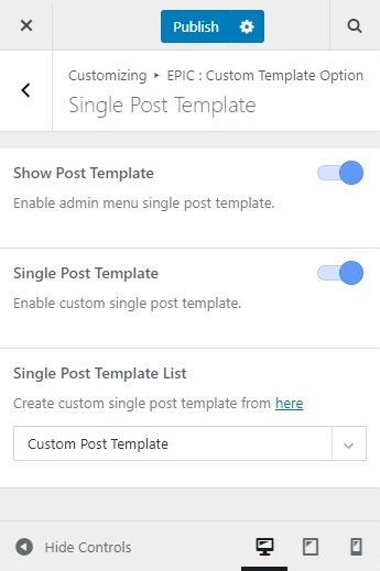 After making a custom post template for the single post then you need to set up the Single Post Setting option. Firstly you need to go to Customizer > EPIC : Custom Template Option > Single Post Tempalte. In there, you will find Single Post Template option. Please check this image below for detail: