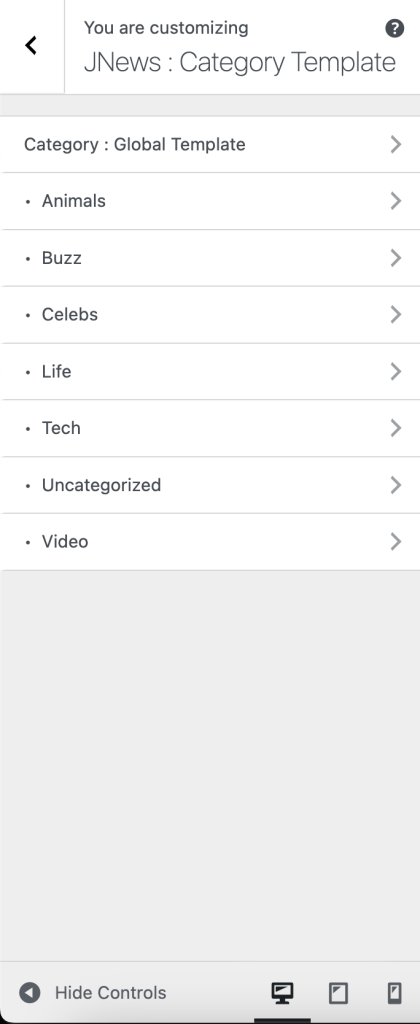 To use JNews – Customize Detail Category plugin, you can go to the menu Customize → JNews: Category Template, it will display a list of categories on your website. You can then override the category template settings for each of your categories.