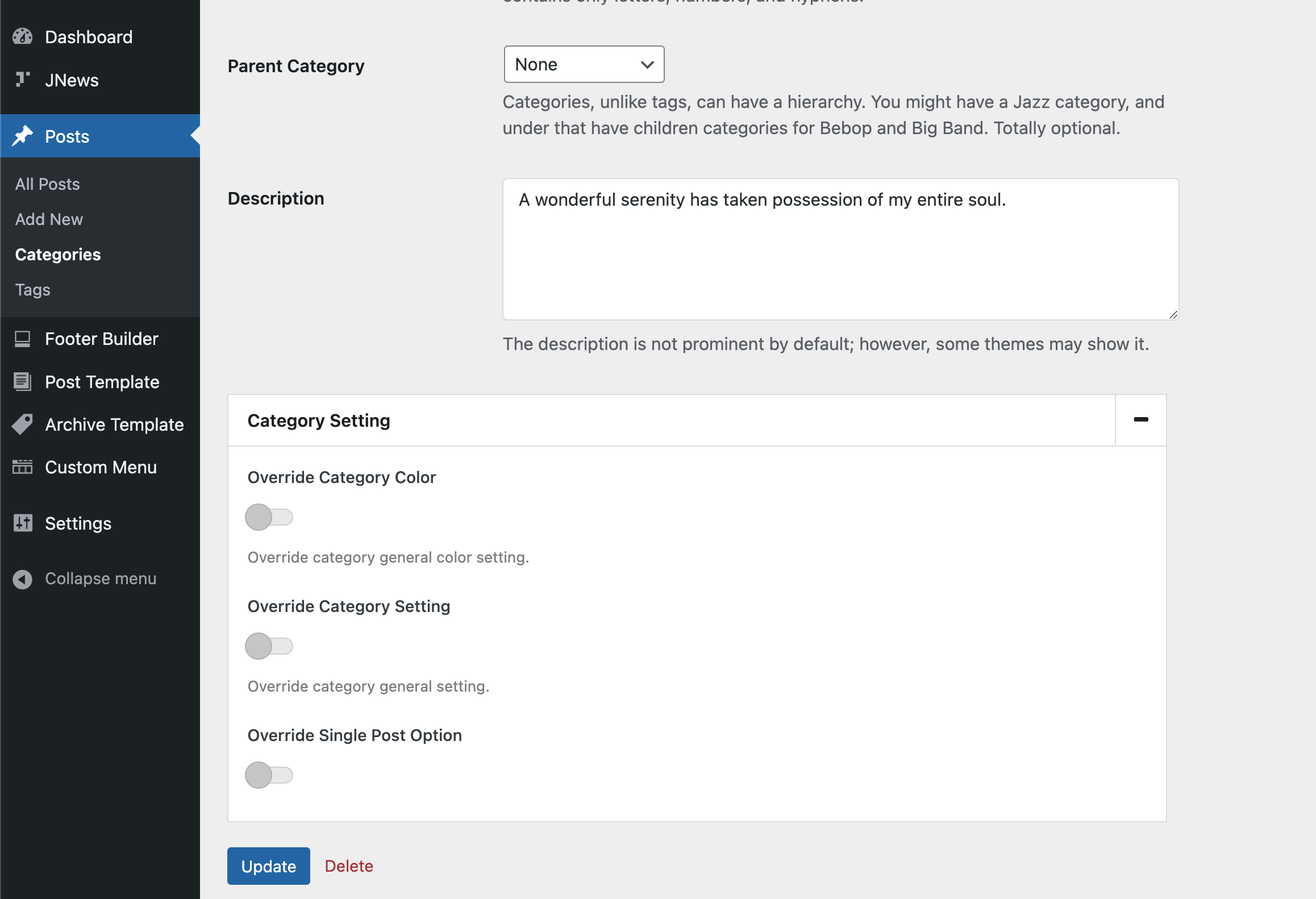 To use the JNews – Extended Category Option plugin, you can go to the menu Dashboard → Post → Categories, then click edit on the category for which you want to override the settings. You can then override the category settings you’ve chosen in the Category Setting menu at the bottom of the category edit page.