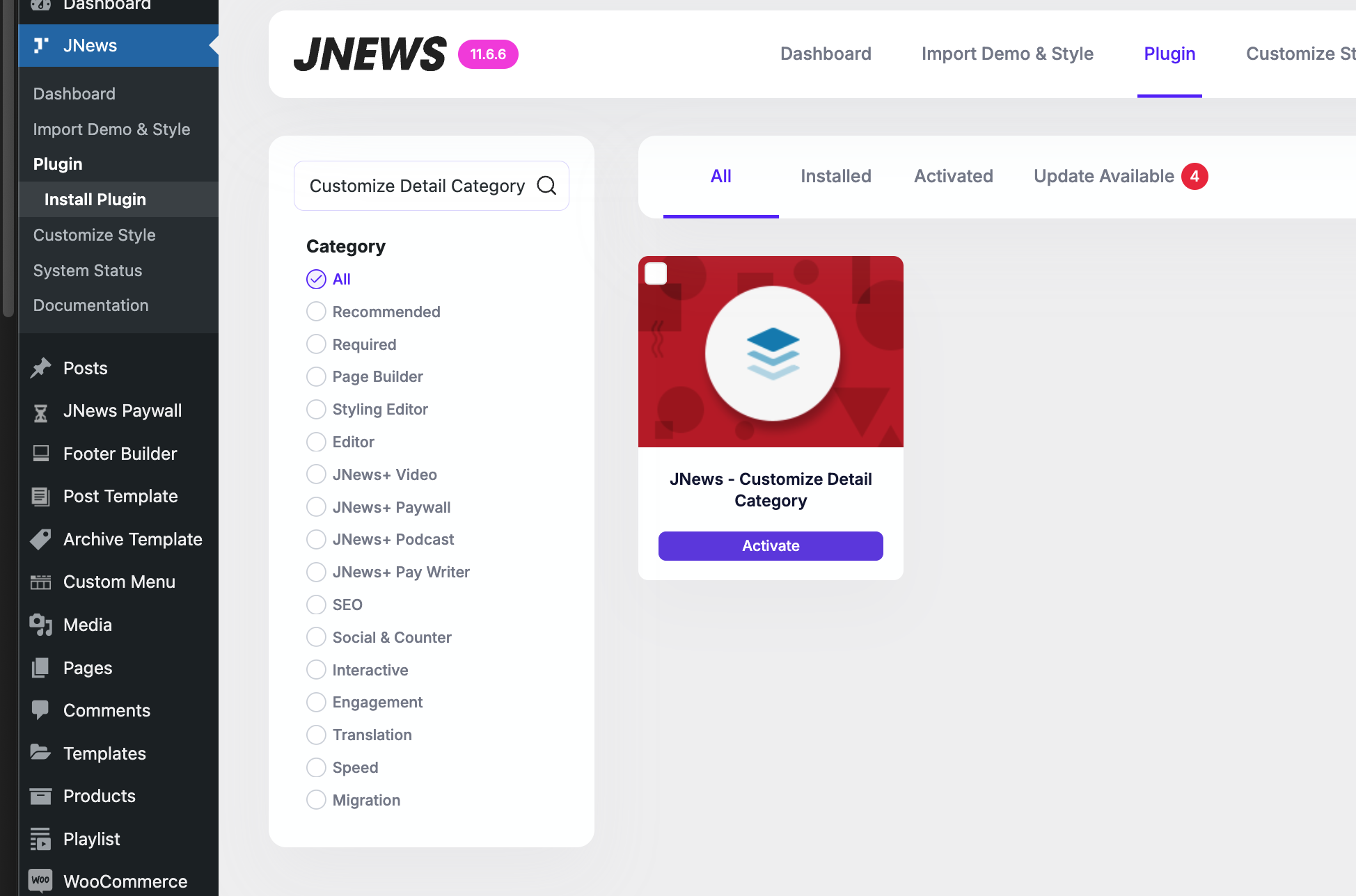 To enable this feature on your website, you just need to install JNews – Customize Detail Category plugin. You can easily install and activate this plugin from Plugin Dashboard by go to JNews Dashboard → Plugin
