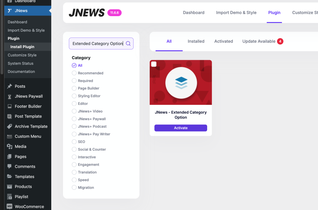 To enable this feature on your website, you just need to install JNews – Extended Category Option plugin. You can easily install and activate this plugin from Plugin Dashboard by go to JNews Dashboard → Plugin