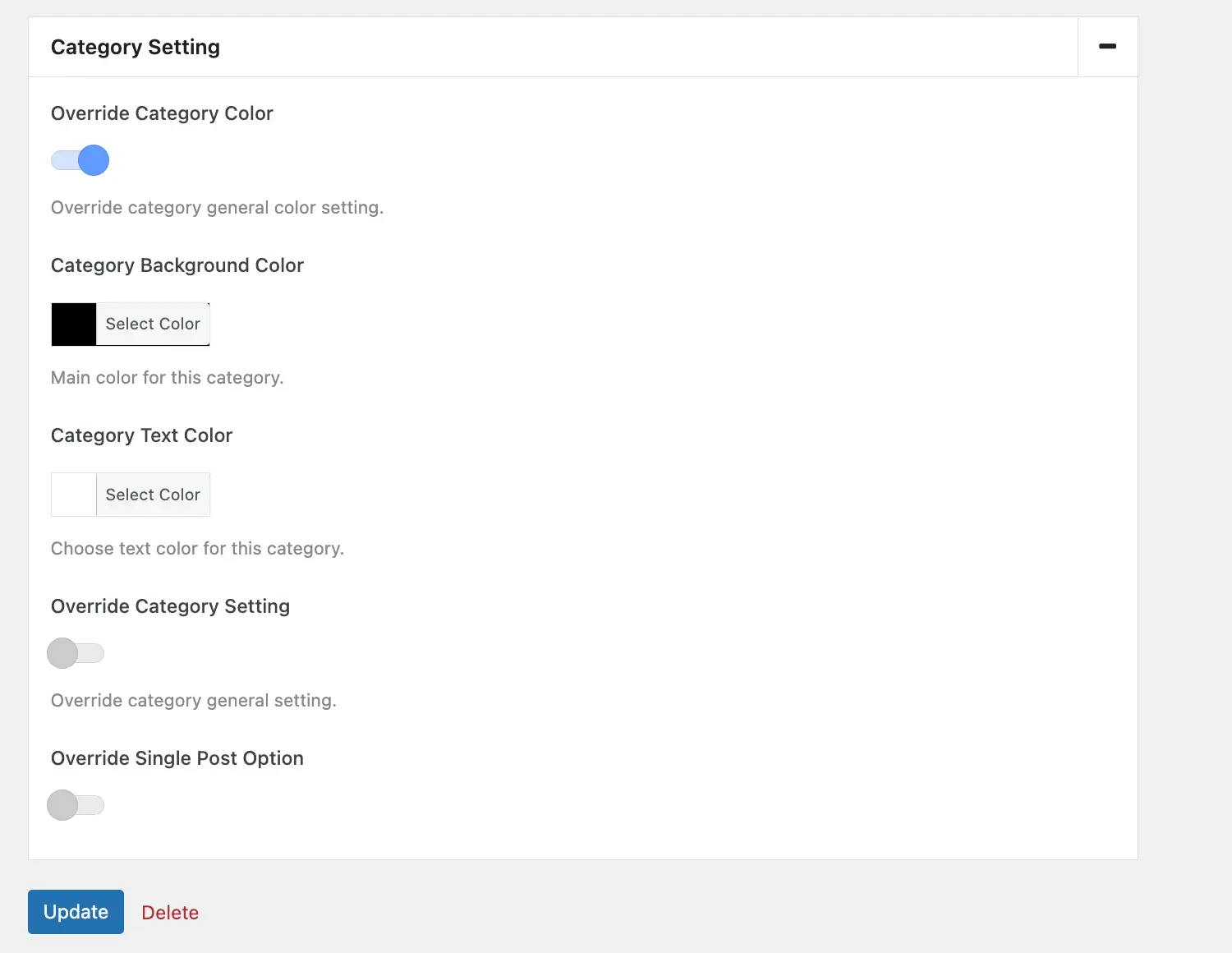 The following options list below will be activated when you enable Override Color option. You can change the category label color style for a specific post category using these options.