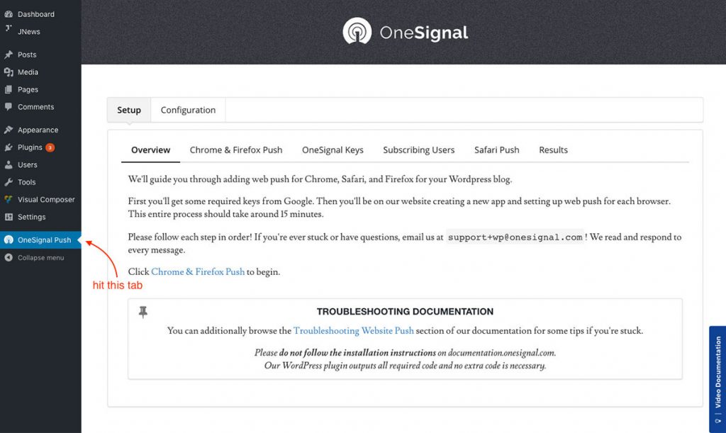 Right after you’ve done with the plugin activation, you will need to do some setup for OneSignal Push. Please check the image below and you just need to follow the plugin instructions under Setup panel the click Chrome & Firefox Push to begin :