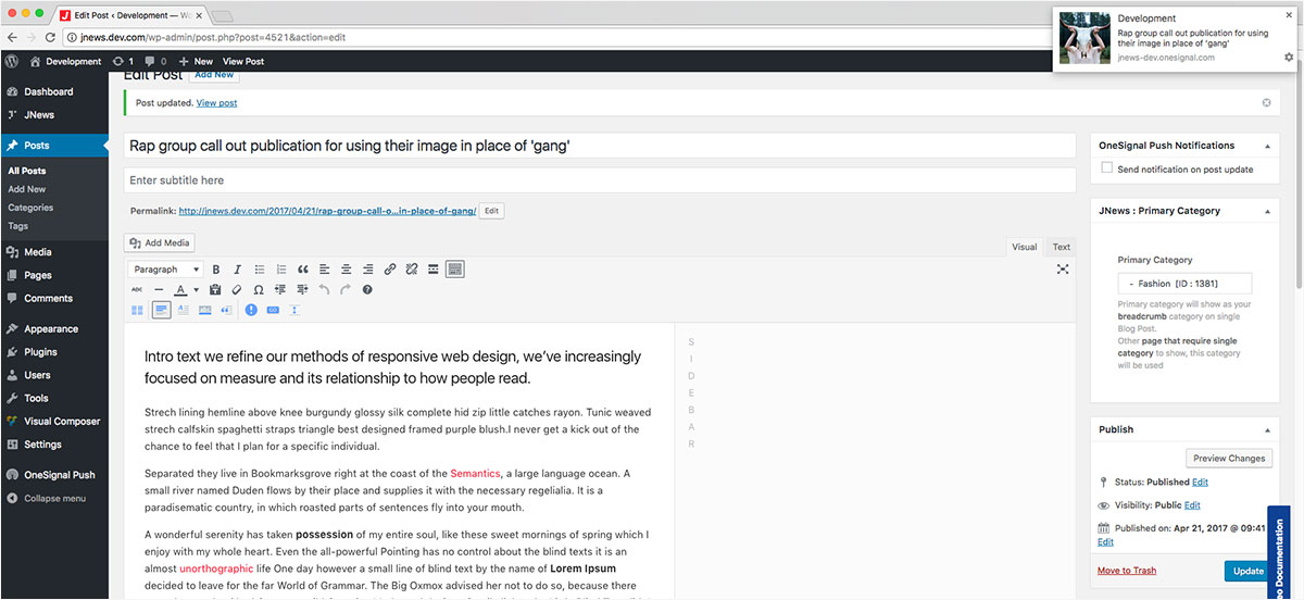 - If you have selected a post, then at the right side section you will notice OneSignal Push Notification metabox. You can check the image below for more detail.