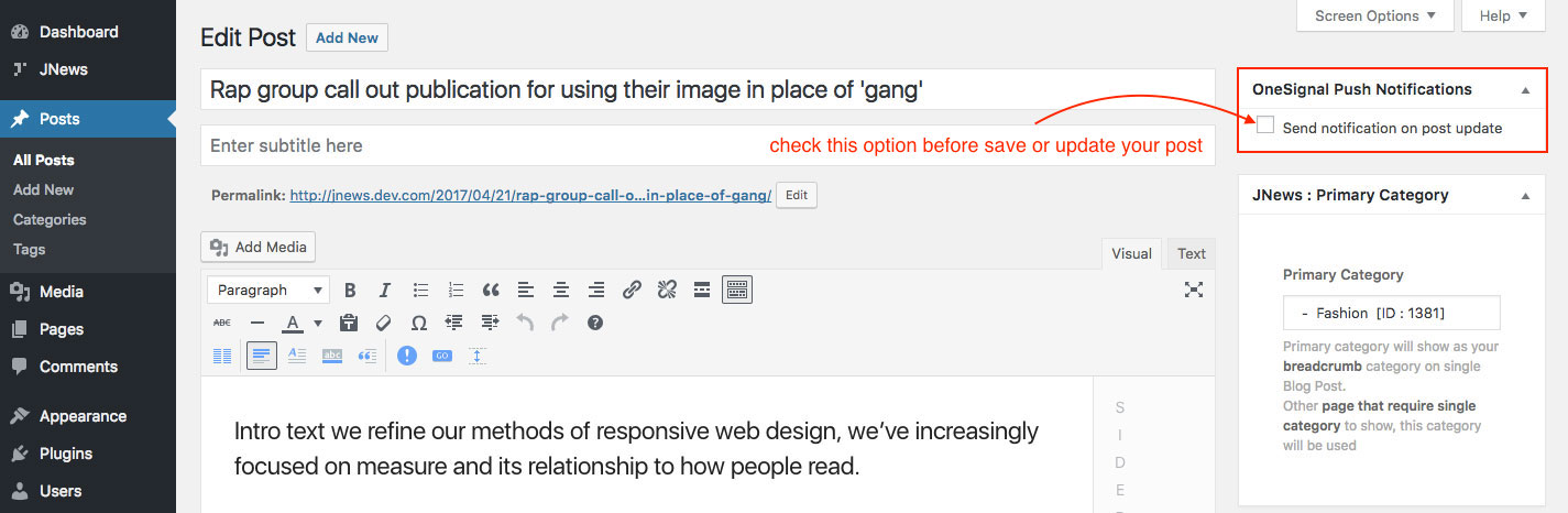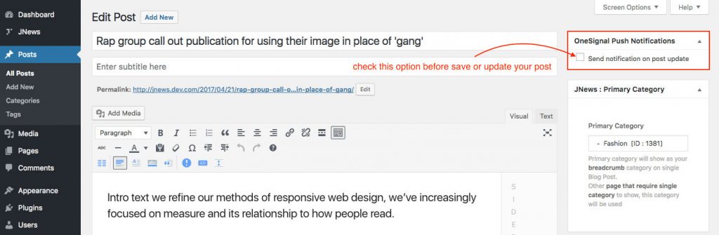 - Please make sure you have checked the box on the option pointed by the image above. After that you just need to save your post and a push notification about that post will be sent.