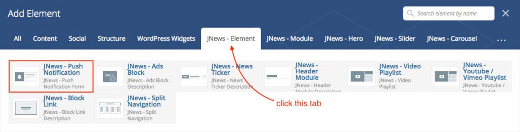 To insert push notification with Visual Composer, simply by Add Element → JNews – Element → JNews – Push Notification