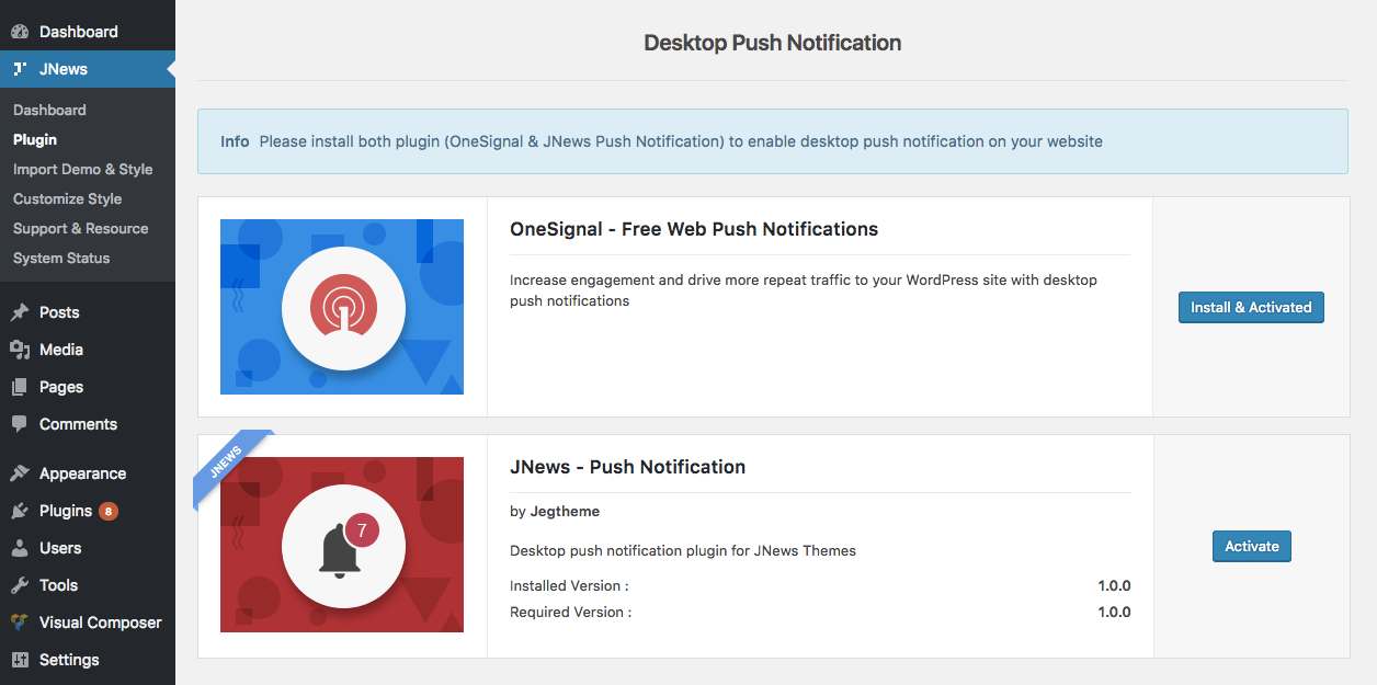 To enable Desktop Push Notification on your website, you will need to install both of OneSignal and JNews Push Notification plugin. You can easily install and activate this plugin from Plugin Dashboard by go to JNews Dashboard → Plugin