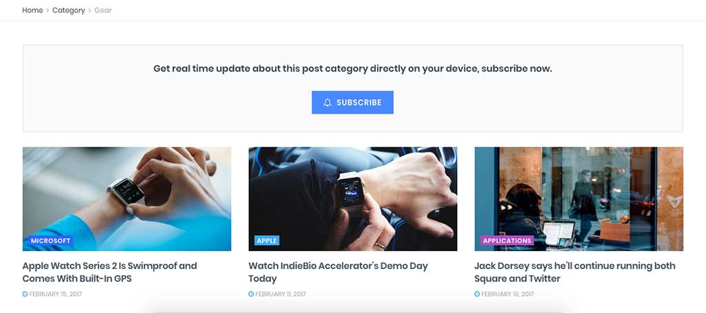 The subscribe notification button feature on a single category page will prompt users to subscribe to the post category by adding User Tags filters to the OneSignal subscriber. Please note that the free version of the OneSignal account can only add 2 Data Tags to each of your subscribers. If you do not wish to upgrade your OneSignal account, we do not recommend to enabling this feature. When the number of User Tags of your subscriber is already more than 2 User Tags, the JNews – Push Notification plugin will fail to add User Tags to those subscribers, and your notifications will not be sent to those subscribers. As an alternative, you can use the JNews – Push Notification Element or Widget to display the subscribe button, because subscribing will only add one User Tag, which will provide notifications for all your articles.