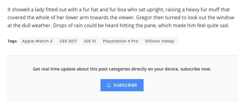 The subscribe notification button feature on single post page will prompt users to subscribe to every related category on the post by adding User Tags filters to the OneSignal subscriber. Please note that the free version of the OneSignal account can only add 2 Data Tags to each of your subscribers. If you do not wish to upgrade your OneSignal account, we do not recommend to enabling this feature. When the number of related categories on the post is more than 2 categories, the JNews – Push Notification plugin will fail to add User Tags to those subscribers, and your notifications will not be sent to those subscribers. As an alternative, you can use the JNews – Push Notification Element or Widget to display the subscribe button, because subscribing will only add one User Tag, which will provide notifications for all your articles.
