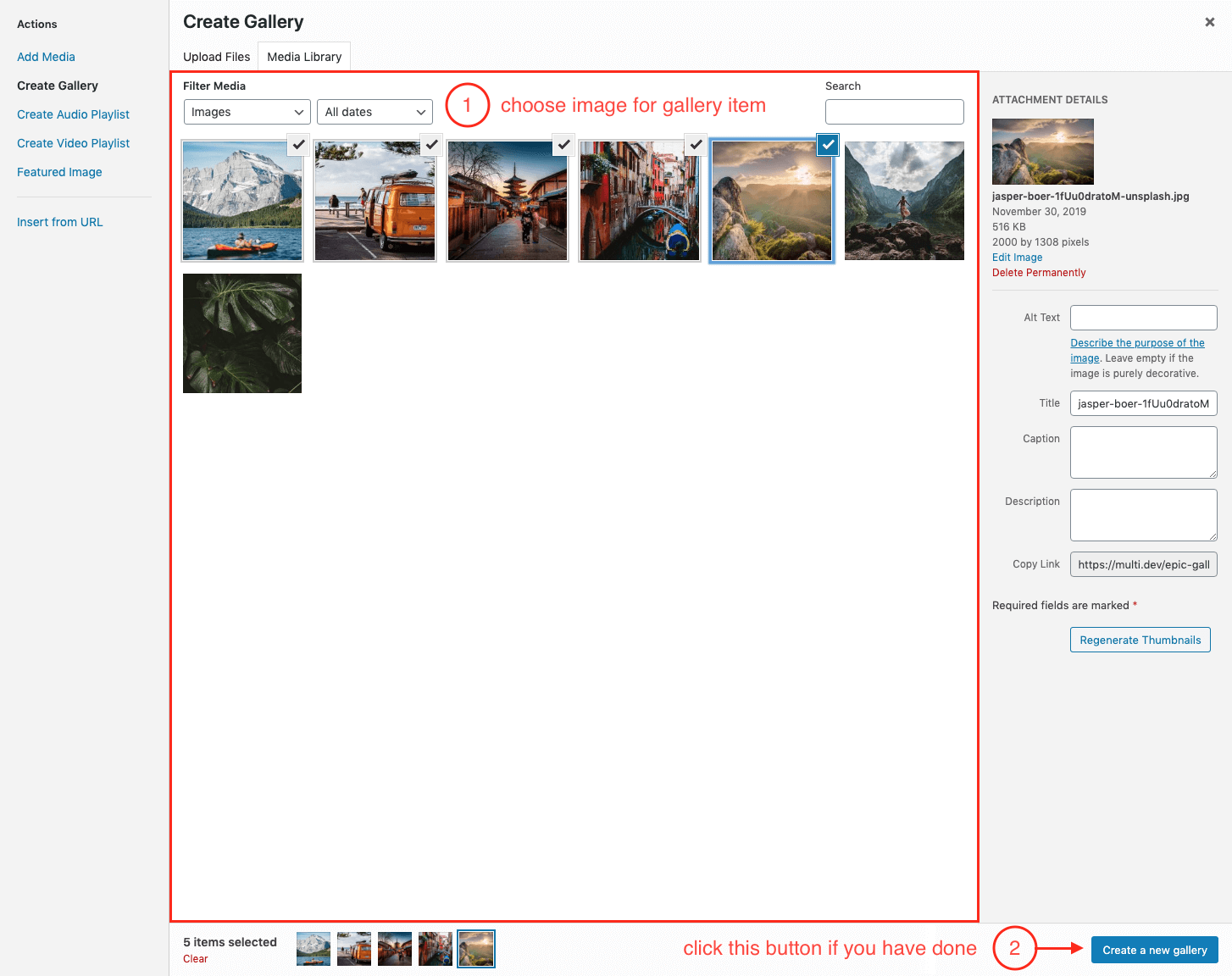 - Then Create Gallery panel will appear and you can choose multiple image that you want to use as image gallery items. If you’ve done then click Create a new gallery button on the right bottom panel.