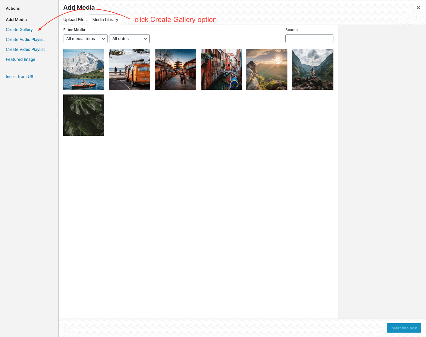 - After Insert Media panel appear, click Create Gallery option on the left panel.
