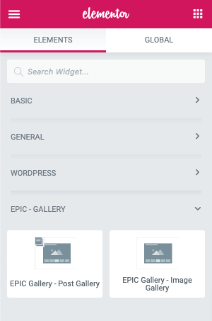Epic Gallery element is available on the Elementor too. You can simply find the Epic Gallery element when adding elements via Elementor page builder.