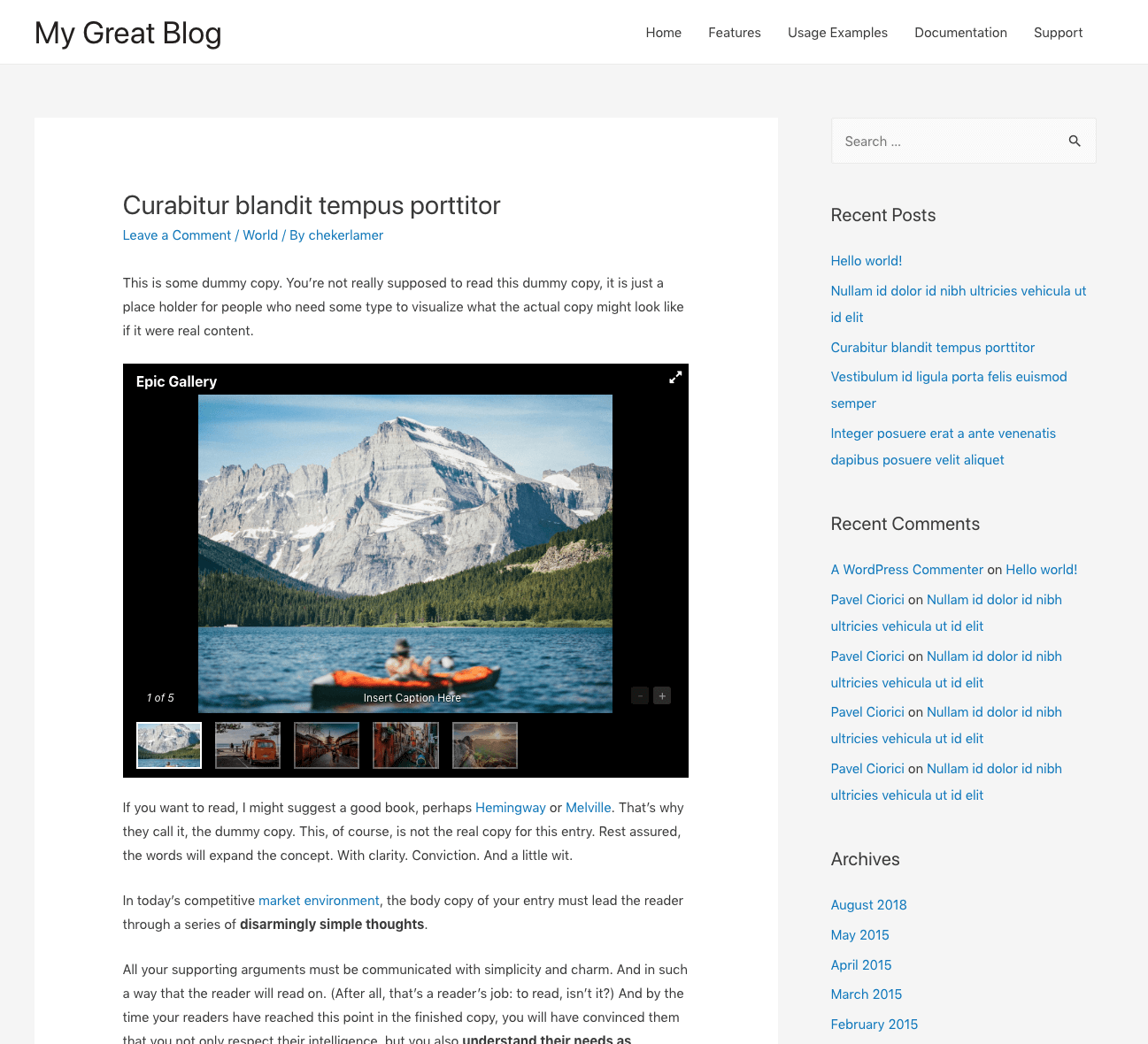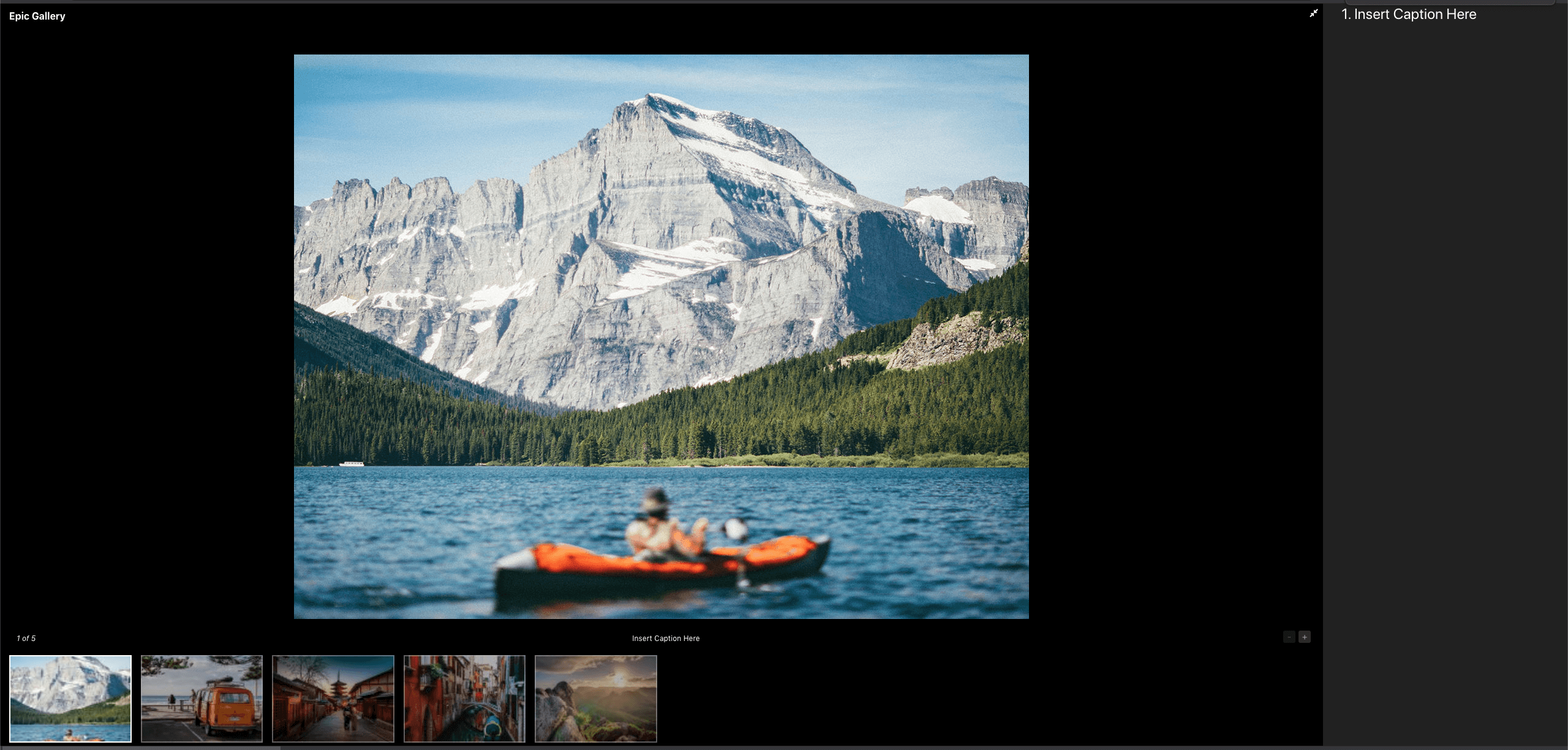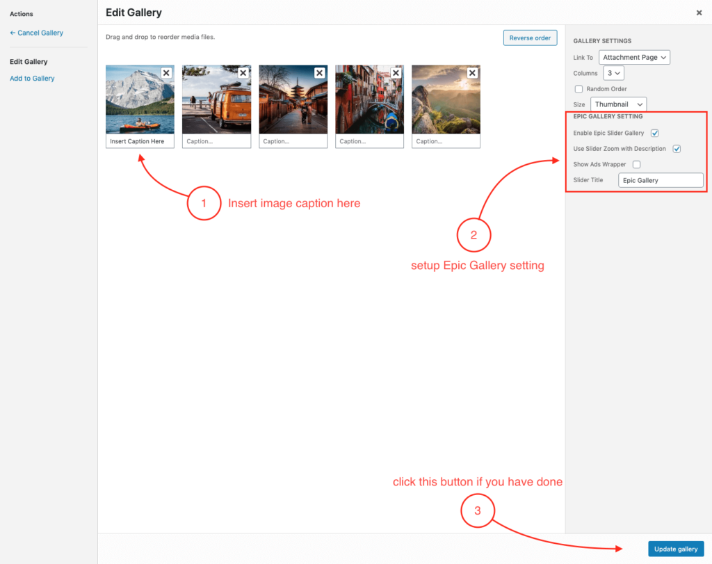 - Next Edit Gallery panel will appear. On this panel, you will need a couple of things. You can insert caption on each image gallery item and also you will notice that there is Epic Gallery Setting section on the right panel. Here’re the following options that you will need to set up on the Epic Gallery Setting :