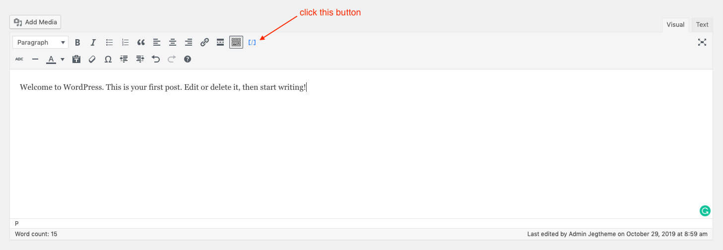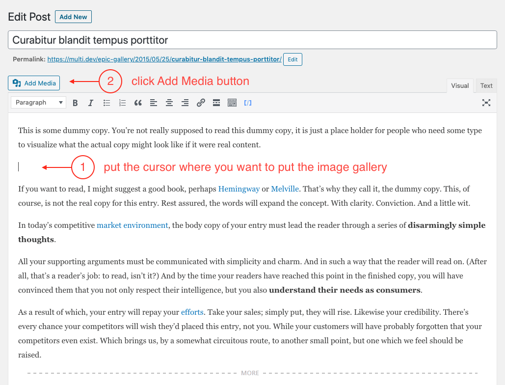 - If you’ve been select a post, then put the cursor on the post content section where you want to place the gallery and click Add Media button.