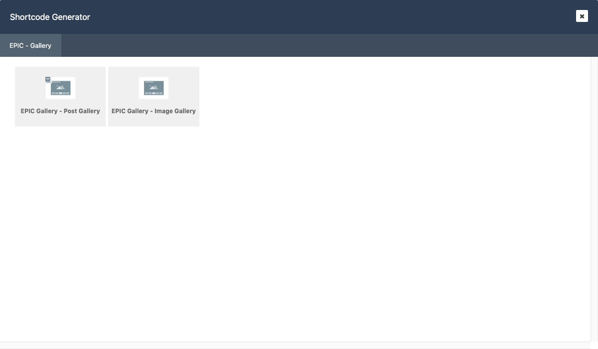We also have a shortcode generator feature that you can use to generate the Epic Gallery shortcode to your content. Please check the following images below: