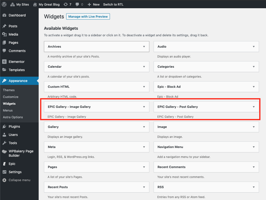 Epic Gallery element is also available on the widget WordPress. You can simply find the Epic Gallery element on the widget dashboard.