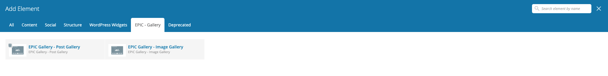 Epic Gallery element is available on the WPBakery page builder. You can simply find the Epic Gallery element when adding elements via the WPBakery page builder.