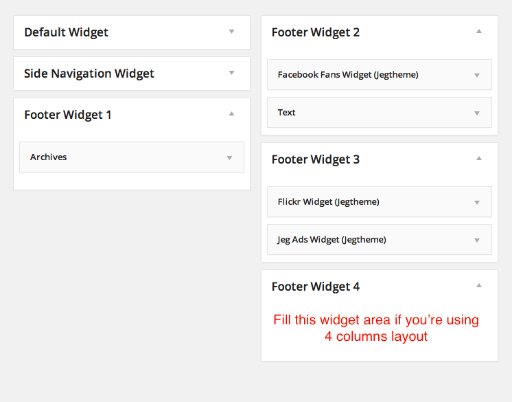 You will need to fill Footer Landing Widget. IF you are using 4 Column layout, you will also need to fill Footer Widget 4. So you need to fill the Footer Widgets based on footer layout that you choose previously on Theme Options.