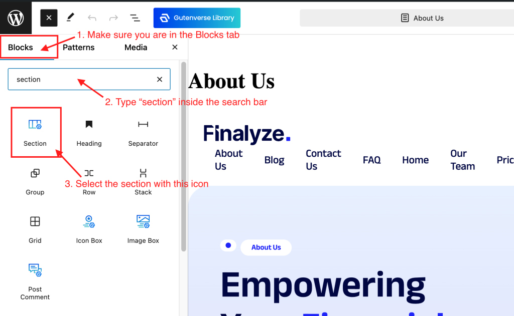 A sidebar on the left will appear, click on the Blocks tab and type “section” inside the search bar.