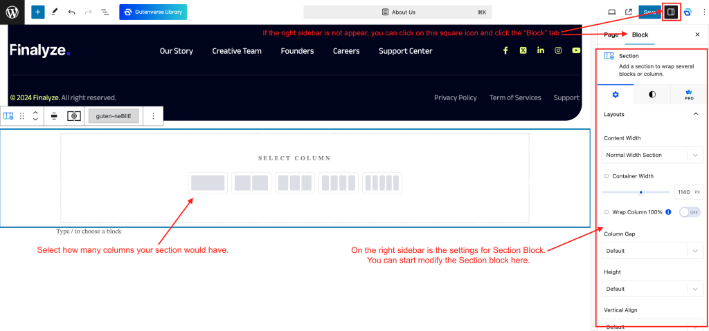 If the sidebar doesn’t appear, click on the square icon on the top right corner of the editor (please refer to the image below).