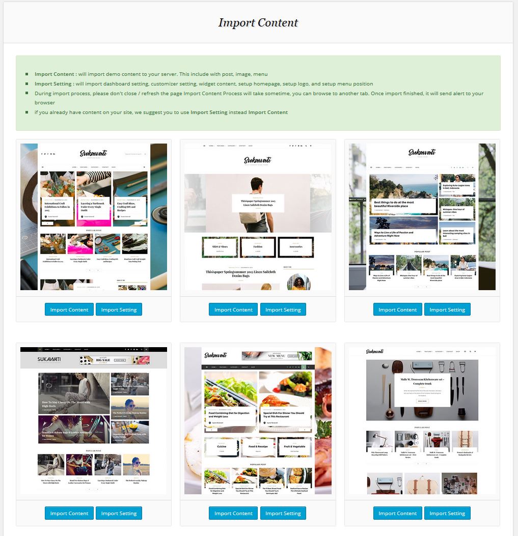 - Import setting : import dashboard setting, customizer setting, widget content, setup homepage, setup logo, and setup menu position