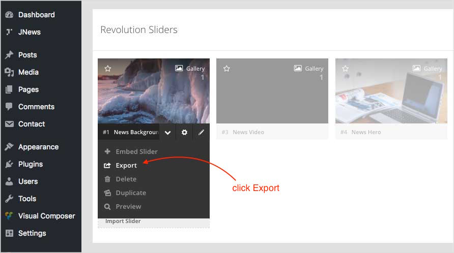 Also, the Revolution Slider allows you to easily export all of your sliders. As you know making animated slides takes a lot of time, make sure you export the data so you don’t ever lose the time you’ve spent on them.