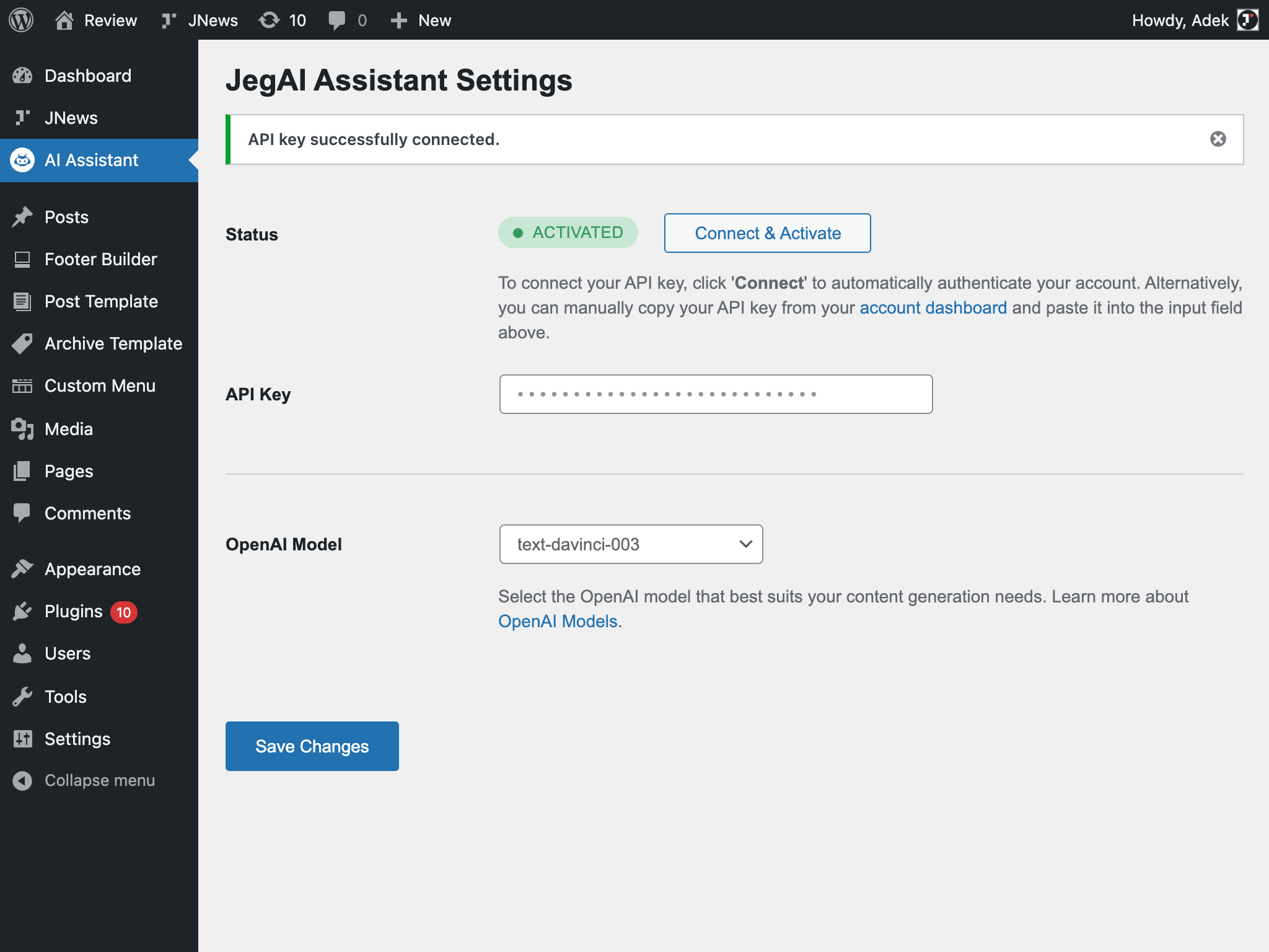 Wait, before you try to connect your API Key, there’s some good news for you. We provide a free trial of JegAI Assistant for JNews users. So if you have a copy of JNews, then you will get free trial access to JegAI Assistant.
