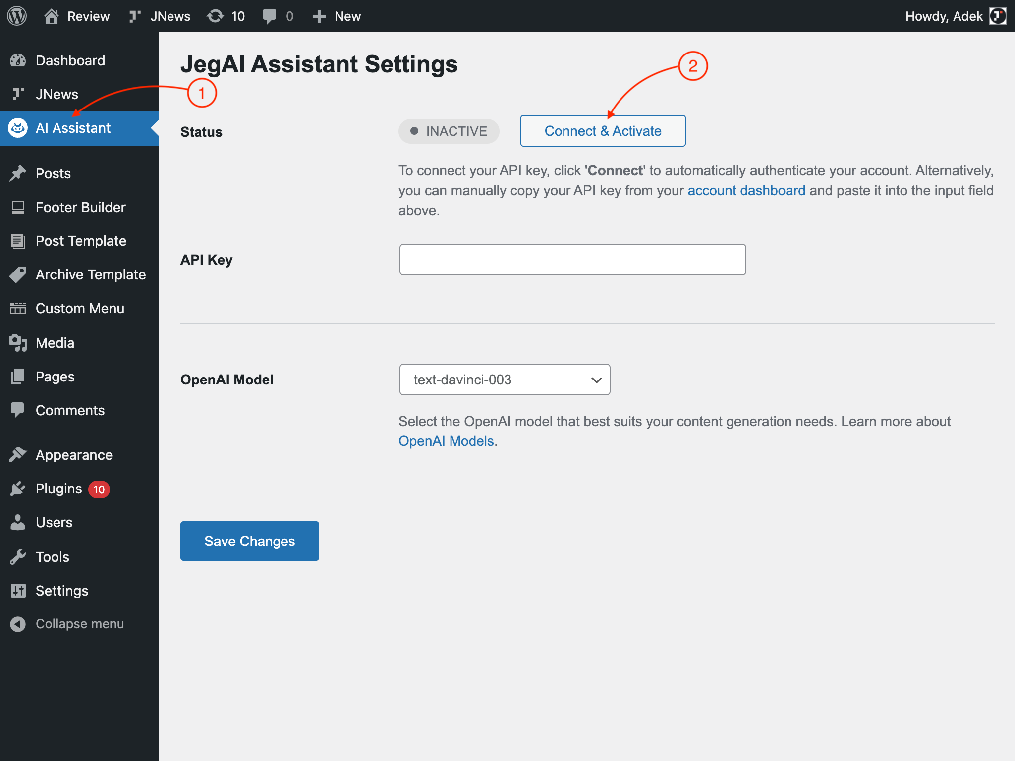 To connect your API Key, go to WordPress Admin Dashboard → AI Assistant. Then click the Connect & Activate button.