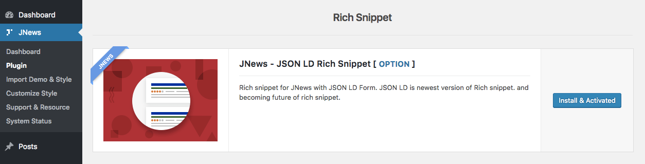 To enable Rich Snippet (JSON-LD) on your website, you just need to install JNews – JSON LD Rich Snippet plugin. You can easily install and activate this plugin from Plugin Dashboard by go to JNews Dashboard → Plugin