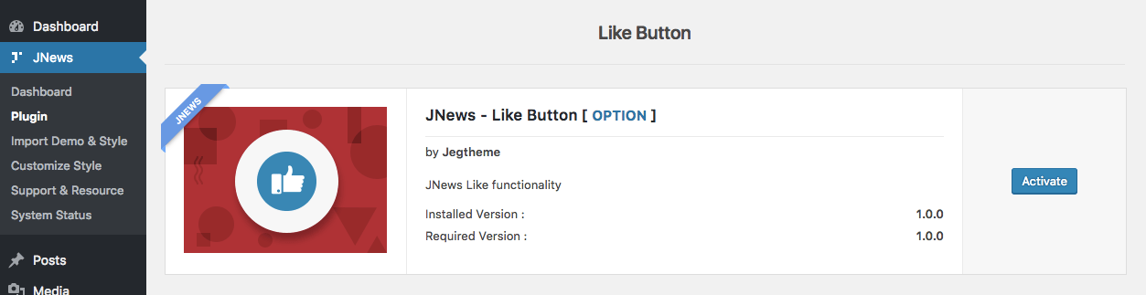 You can access like post button option by simply hit the Option button on the Plugin Dashboard or go to JNews Dashboard → Customize Style → JNews : Social, Like & View → Like Button Setting