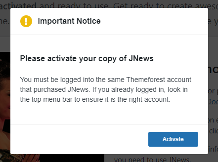 If you encounter the Important Notice in the attempt of activating the theme license, this suggests that you are trying to activate the theme with an Envato account that did not purchase the theme.