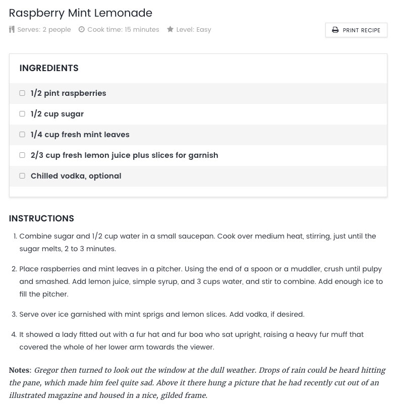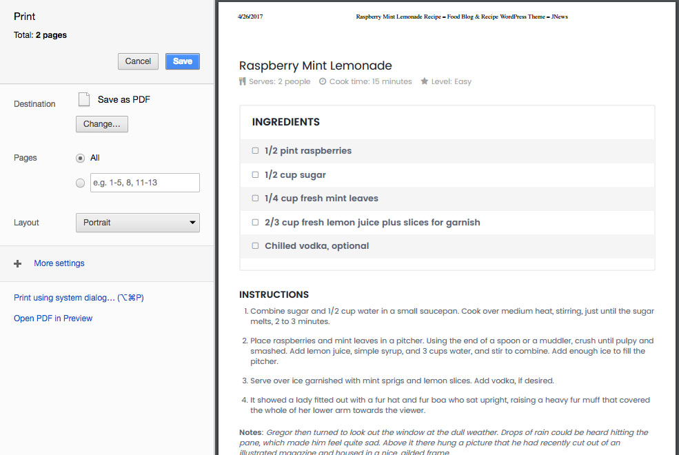 The following attached images are the food recipe preview and the print food recipe preview.