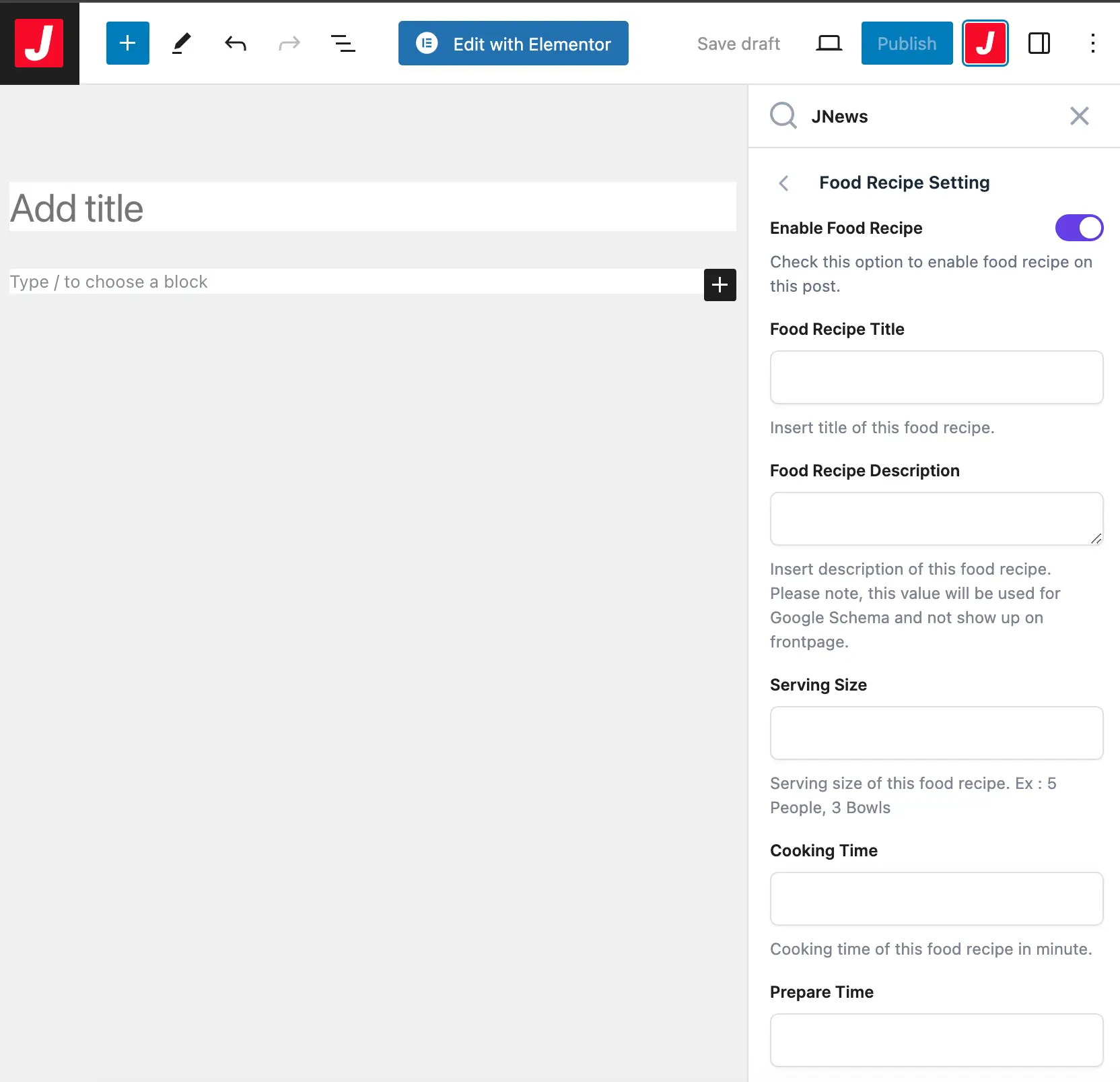In this case, creating a food recipe is the best way you can serve those dishes up to your audiences. With JNews, feel no worry, because we have provided powerful feature to insert food recipe into your post.