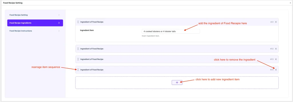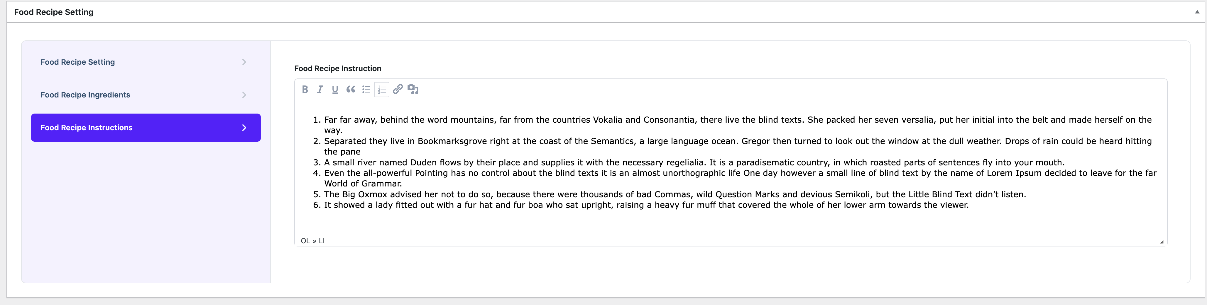 - After have done with Food Recipe Ingredients setup, next you can click Food Recipe Instructions tab. In this part you can insert all of instructions for the food recipe.