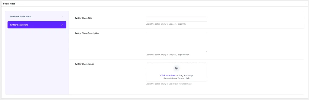 On this option you can insert description for the share. Leave empty this option if you want to use post or page excerpt by default. - Twitter Share Image