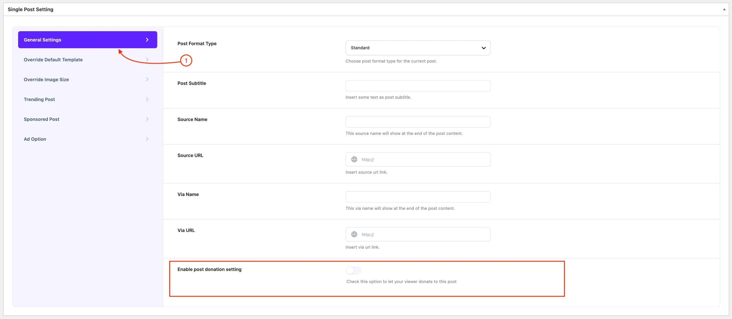 Enable Donation option will only be visible if the Donation on All Post at Customizer is enabled.