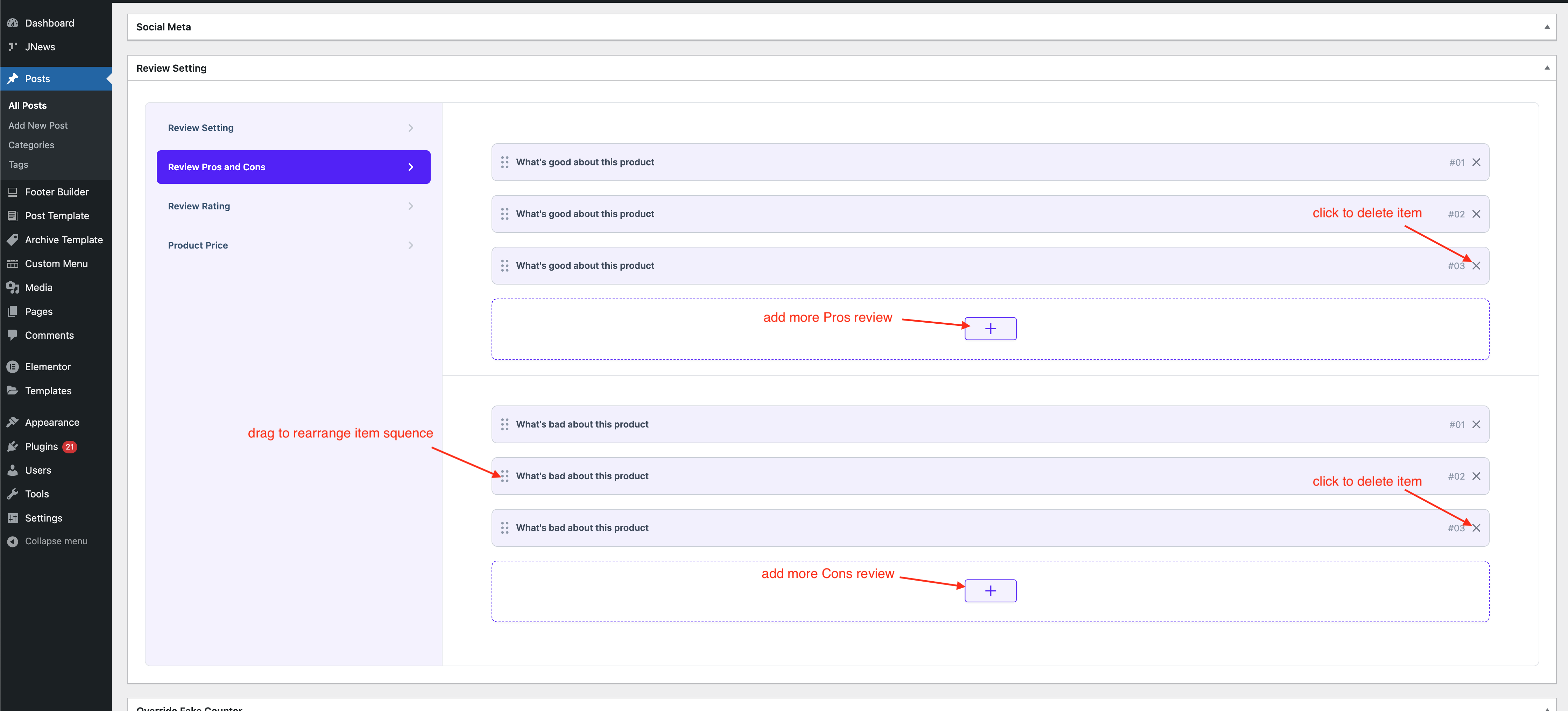 - After have done with Review Setting setup, next you can click Review Pros and Cons tab. On this part you can insert the pros and cons of your product.