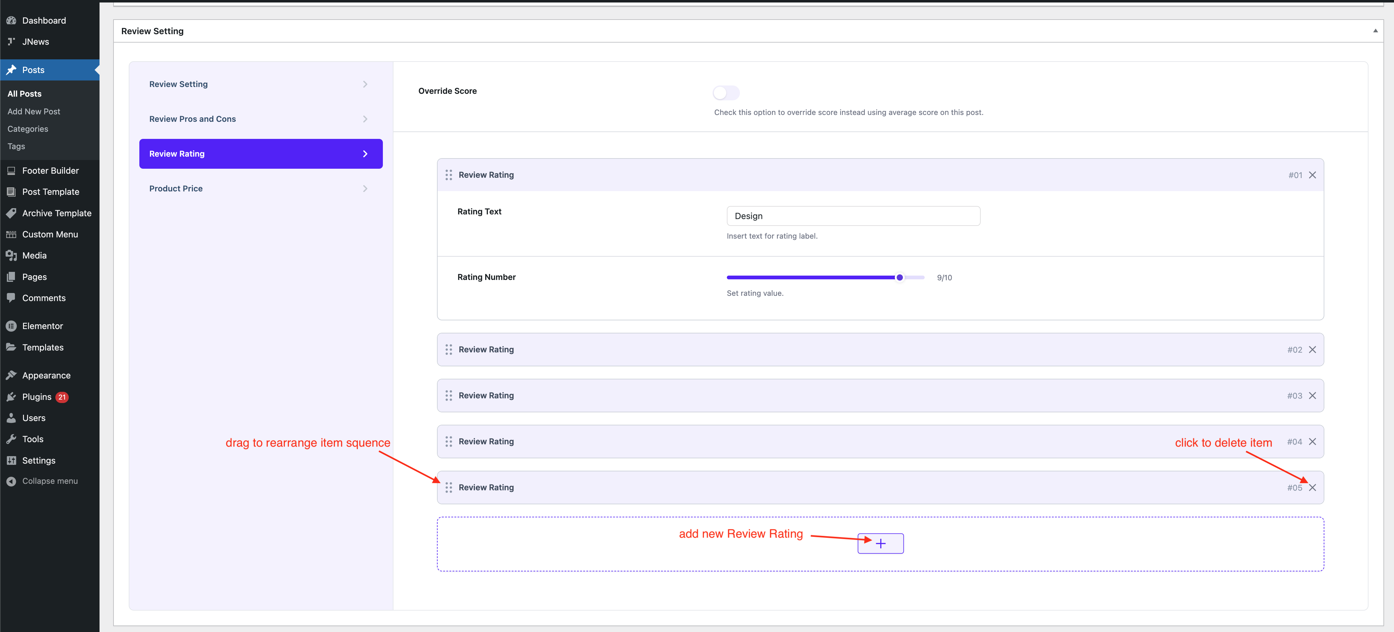 You can also add more items or remove certain item from the item list and simply rearrange rating items sequence as you want through drag and drop.
