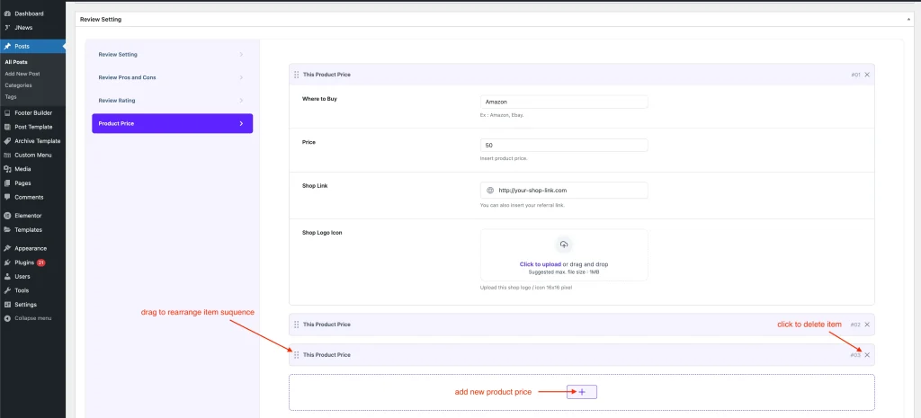 - When you finish Review Rating setup, the last step to complete your review is to click on the Product Price tab.